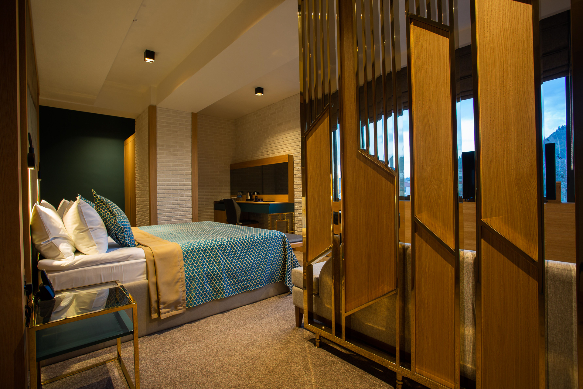 - Özel Tasarım Bölücüler: Odalarda estetiği koruyarak alanları ayıran ahşap ve pirinç detaylı dekoratif paneller, hem mahremiyet sağlıyor hem de görsel bir şölen sunuyor.